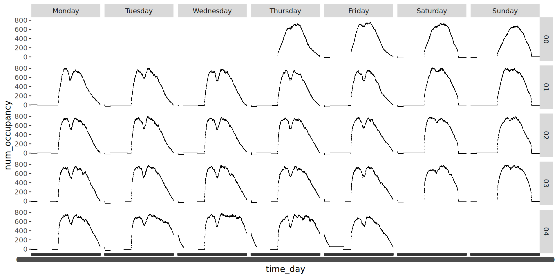 geom_point(shape=".")+facet_grid(week~weekday)library(ggplot2)
